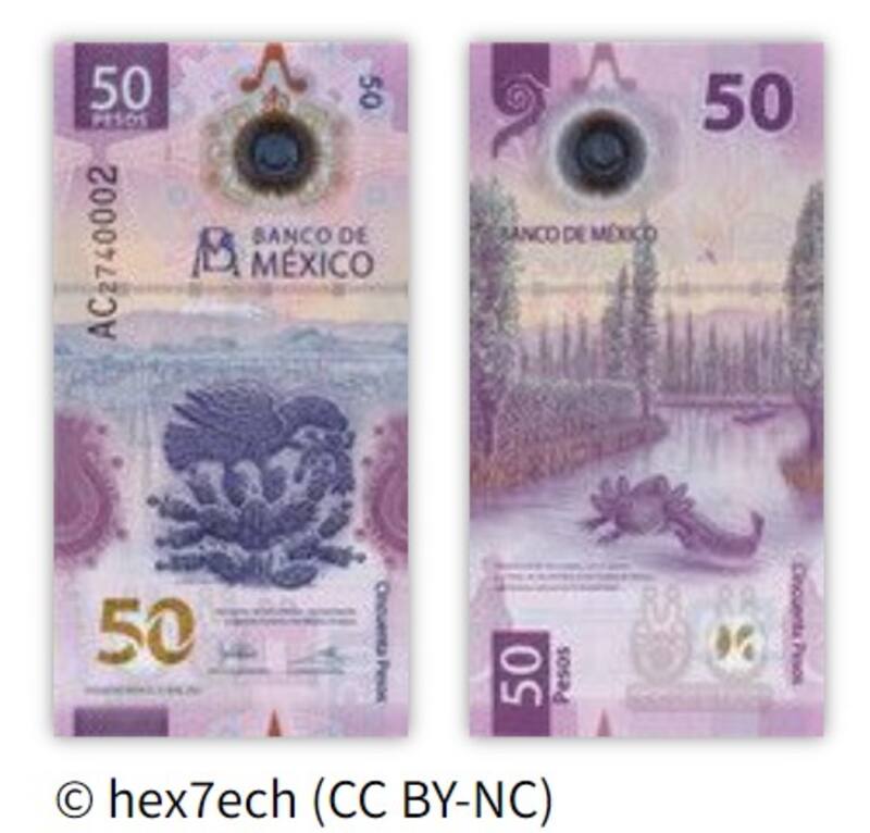 Uno de los billetes más buscados actualmente es el de 50 pesos con la imagen del ajolote. Este billete pertenece a la familia G, mide 125 x 65 milímetros, está hecho de polímero en color morado y fue lanzado en circulación el 28 de octubre de 2021.