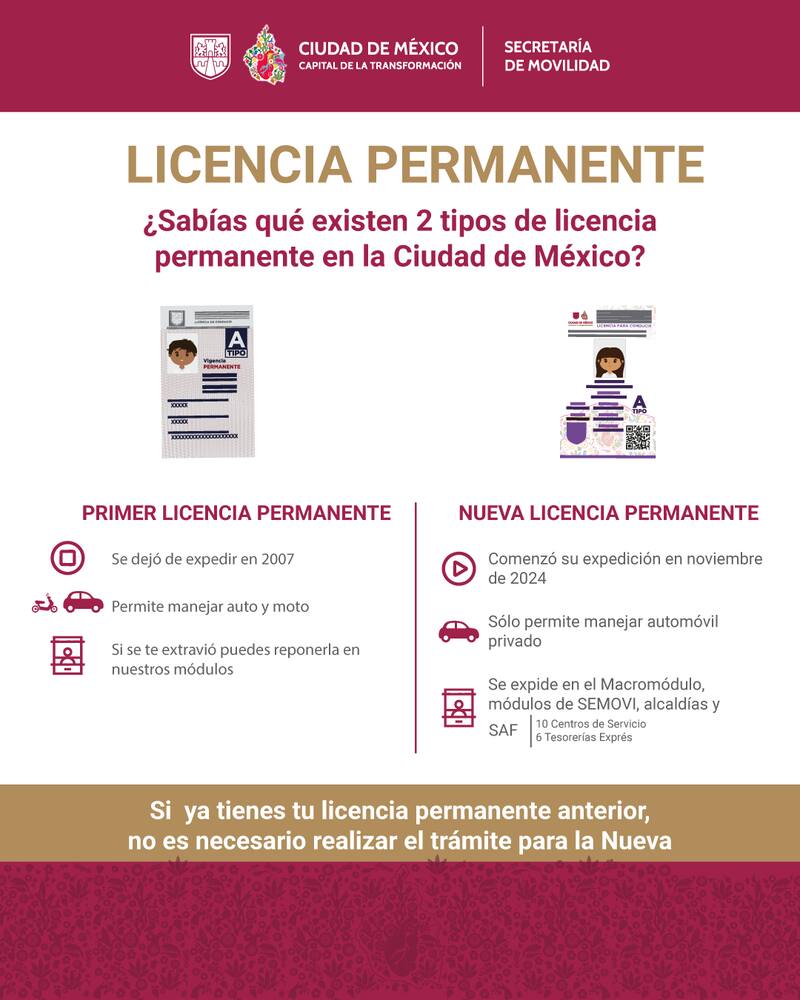 Cabe destacar que esta licencia se expide en el Macromódulo, módulos de la Secretaría de Movilidad (SEMOVI) de CDMX, alcaldías y SAF.