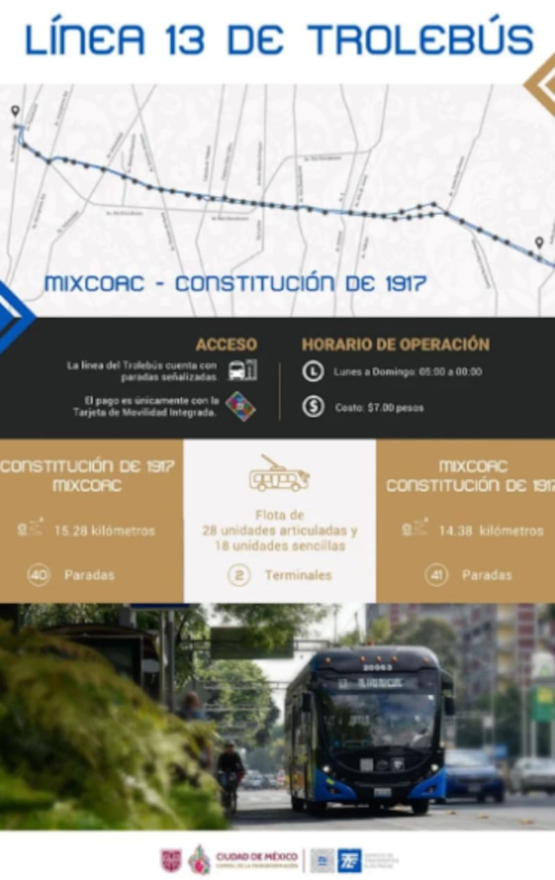 Los habitantes de CDMX que quieran moverse por la Capital haciendo uso de la Línea 13 del Trolebús deberán abonar una tarifa de 7 pesos por viaje, a excepción de los menores de 5 años, las personas con discapacidad y los adultos mayores de 60 años que no deberán abonar el pasaje.