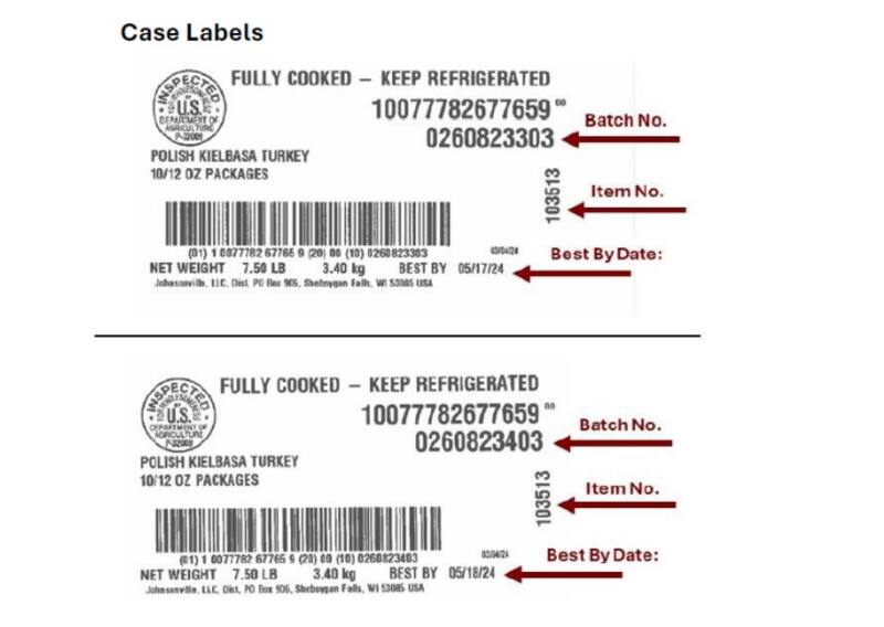 Los paquetes envasados de 12 onzas que contienen una sola pieza de la salchicha"Johnsonville Polish Bielkbasa Turkey", con fecha de caducidadentre el 17 de mayo de 2024 y el 18 de mayo de 2024, han sido retirados de todos los supermercados debido a preocupaciones sobre posible contaminación con materiales extraños durante su producción.