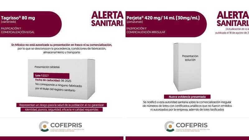 Se trata de dos medicamentos empleados en el tratamiento de tipos específicos de cáncer:Perjeta (pertuzumab) solución 420 mg/ 14 mL (30mg/mL) y Tagrisso (osimertinib) 80 mg. Los números de lote detectados son: