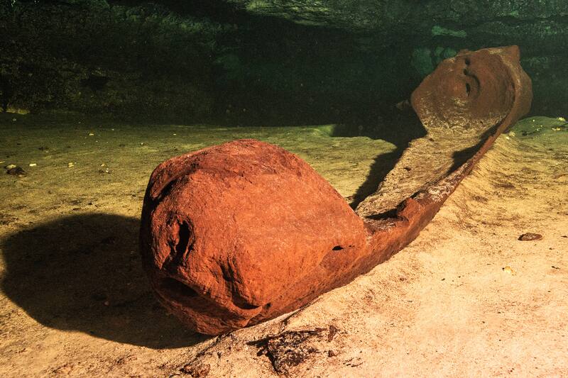 Entre los tesoros subacuáticos descubiertos destaca una canoa hallada en una cueva inundada en la comunidad de San Andrés, cerca de Valladolid, Yucatán.