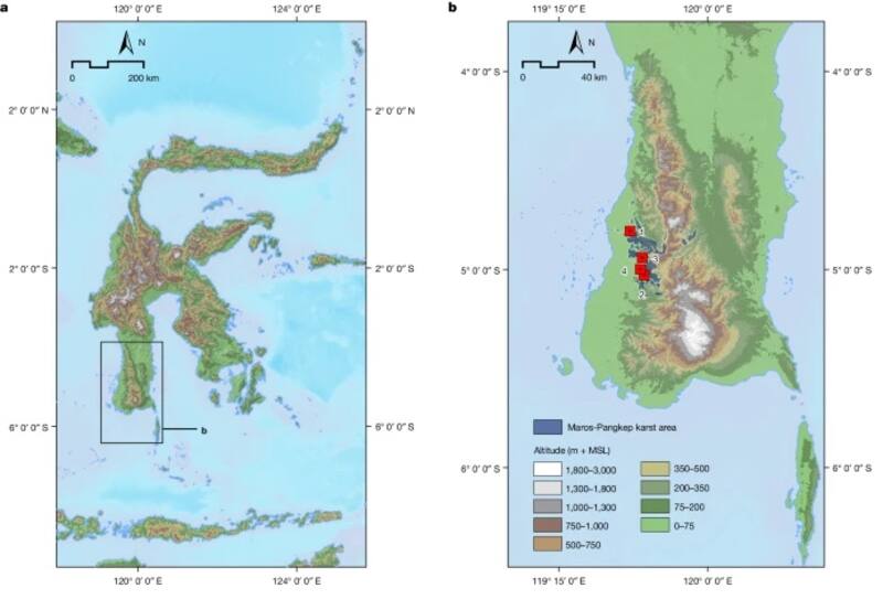 En 2014, un equipo de científicos de Australia e Indonesia descubrió que las pinturas encontradas en siete cuevas del suroeste de Sulawesi tenían entre 39.900 y 17.400 años de antigüedadpero que incluso podrían ser más antiguas. En 2020, otro equipo de australianos anunciaba que una escena de caza hallada en las cuevas de la isla tenía 43.900 años.