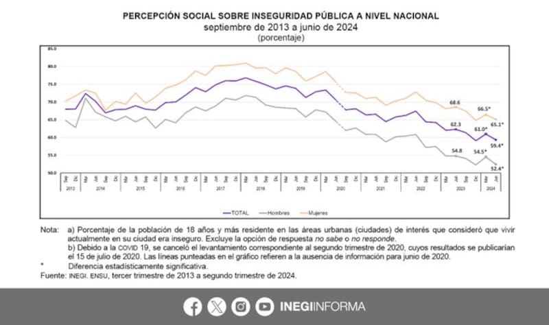 De acuerdo con datos recabados en la Encuesta Nacional de Seguridad Pública Urbana (ENSU) del segundo trimestre de 2024, el 65,1% de las mujeres y 52,4% de hombres consideró que vivir en su ciudad era inseguro.