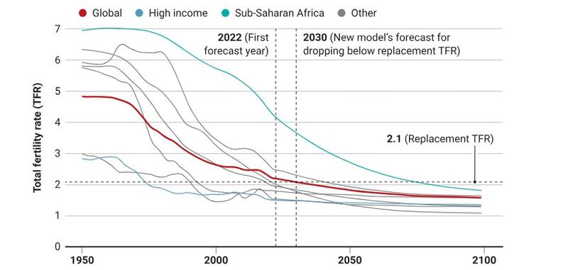 Para mantener estable el tamaño de la población a largo plazo, se requiere una tasa de fertilidad de 2,1 hijos por mujer en edad fértil. Sin embargo, en muchas regiones, este nivel no se está alcanzando.