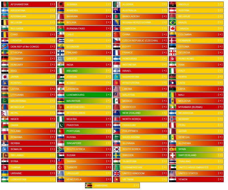 El ranking se codificapor colores (Verde, Amarillo y Rojo) para representar la posición de cada país en el "camino hacia la guerra", indicando su nivel de tensión o participación en conflictos.