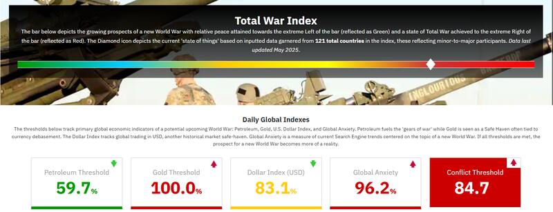 El informe presenta un "Total War Index" (Índice de Guerra Total) que visualiza el "estado actual de las cosas" a nivel global basándose en datos de 131 países. También incluye "Índices Globales Diarios" que miden la posición o el "umbral" alcanzado en indicadores como el precio del petróleo, el oro, el valor del dólar, la ansiedad global (basada en tendencias de búsqueda) y un umbral de conflicto general.