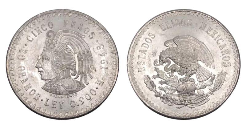 Se trata de la moneda de 5 pesos fabricada con plata ley (0.900), la cual circuló en el territorio mexicano entre los años 1947 y 1948. Su valor no solamente se debe al material con el que fue hecha, sino también a algunos detalles particulares que se observan en ella.