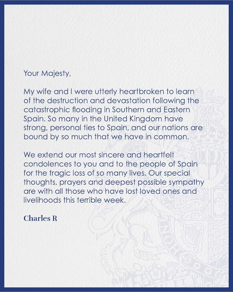 "Le enviamos nuestras más sinceras y sentidas condolencias a Usted y al resto del pueblo de España por la trágica pérdida de tantas vidas. Nuestros pensamientos especiales, oraciones y nuestro más sentido pésame están con todos aquellos que han perdido a sus seres queridos y sus medios de vida en esta terrible semana", concluye la carta, firmada Carlos R (Carlos rey).