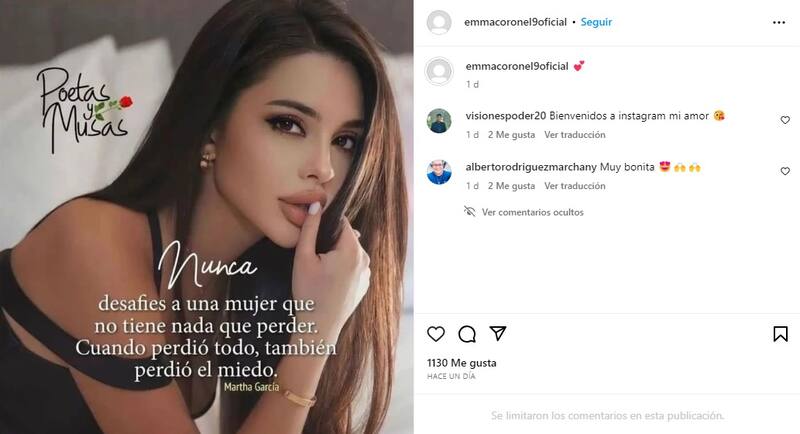La exreina de belleza estrenó su cuenta emmacoronel9oficial hace apenas unos días y ya reclutó más de 8 mil seguidores. En su descripción aparece la frase "Nunca dejes que tus sentimientos dominen tu inteligencia" y optó por no colocar una fotografía de perfil.