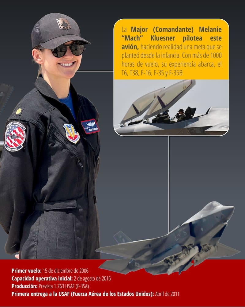 Desde niña soñaba con esta misión y hoy, con más de 1,000 horas de vuelo en distintos jets como el T-6, T-38, F-16 y el F-35B, representa el avance del rol femenino en la USAF. Su presencia en la cabina de uno de los cazas más temidos del mundo inspira una nueva generación de mujeres en la defensa aérea.