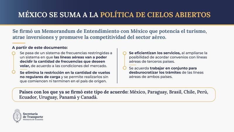 "(El convenio de Cielos Abiertos) permitirá ofrecer servicios desde y hacia cualquier punto, incluyendo vuelos de cabotaje con destinos intermedios; y ampliará convenios de código compartido", garantizando así mayores y mejores ofertas para los viajeros y turistas entre México y Argentina.