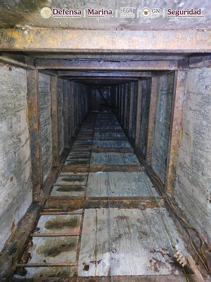 Esta tercera imagen ofrece una vista completa y cenital del corredor subterráneo con paredes y techos recubiertos, evidenciando la inversión en infraestructura para el crimen organizado.