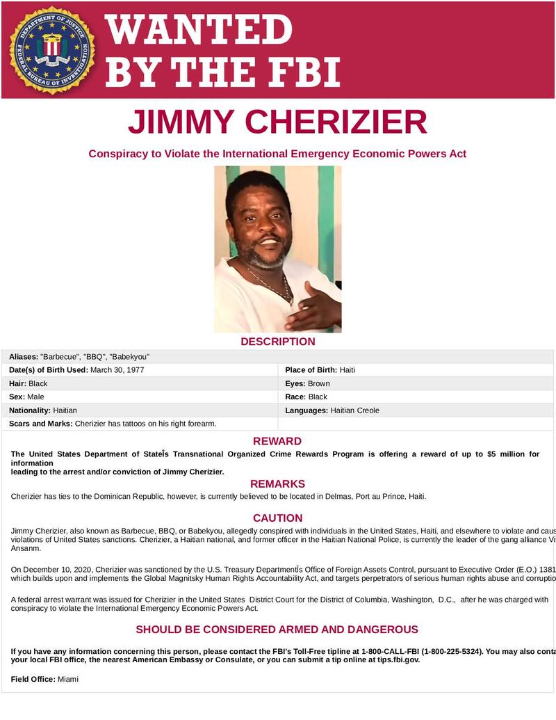 El Departamento de Estado de los Estados Unidos anunció que ofrece "una recompensa de hasta 5 millones de dólares por información que conduzca al arresto y/o condena de Jimmy Cherizier", alias Barbecue, BBQ o Babekyou. Según autoridades, el haitiano, ex oficial de la Policía Nacional, lidera actualmente la alianza de pandillas Viv Ansanm.