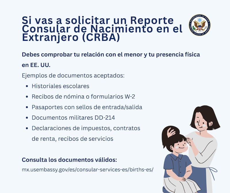 Si estás por tramitar el Consular Report of Birth Abroad o CRBA para tu hijo, el Gobierno de Estados Unidos exige acreditar dos puntos clave. "Debes demostrar tu relación biológica con el menor y tu presencia física en EE.UU. antes del nacimiento", así lo detalló la Embajada en México a través de sus canales oficiales.