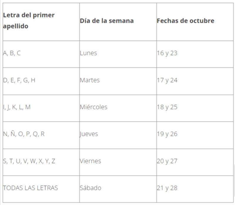 Apellidos que comienzan con las letras A, B y C: lunes 15 y 23 de octubre