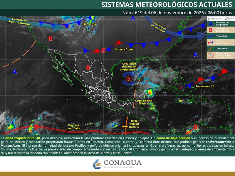 Para hoy, la onda tropical núm. 40, poco definida, se desplazará sobre el sureste del país ocasionando lluvias puntuales fuertes en Oaxaca y Chiapas. Al mismo tiempo, un canal de baja presión sobre la península de Yucatán, aunado al ingreso de humedad del golfo de México y mar caribe, originará lluvias fuertes en regiones de Tabasco, Campeche, Yucatán y Quintana Roo.