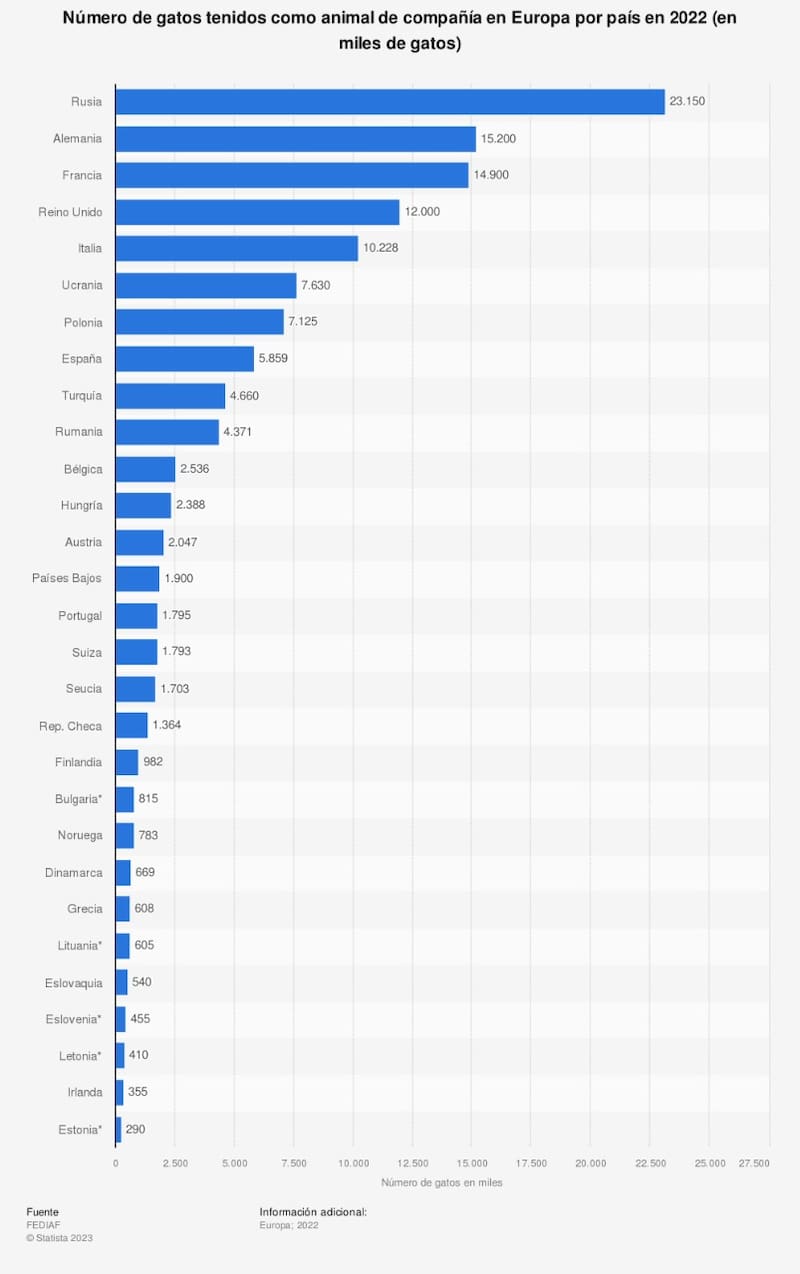 Según una estadística publicada por Statista, Europa se lleva el número uno como la región del mundo con mayor cantidad de gatos domésticos.