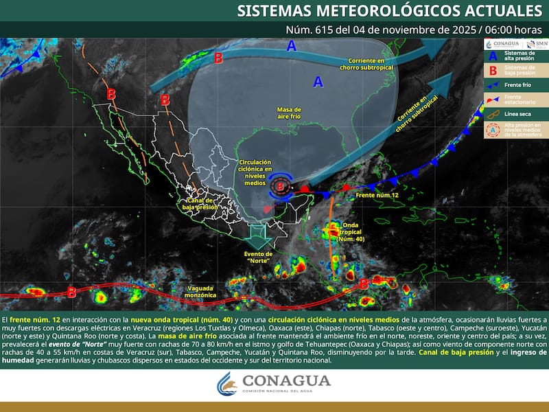 De acuerdo a la información que proporcionó el organismo gubernamental a través de sus canales oficiales de comunicación, el frente frío número 12 interaccionará con la nueva onda tropical (núm. 40) que se aproximará a Quintana Roo y con una circulación ciclónica en niveles medios de la atmósfera sobre el golfo de México, ocasionando intensas precipitaciones en distintos estados.