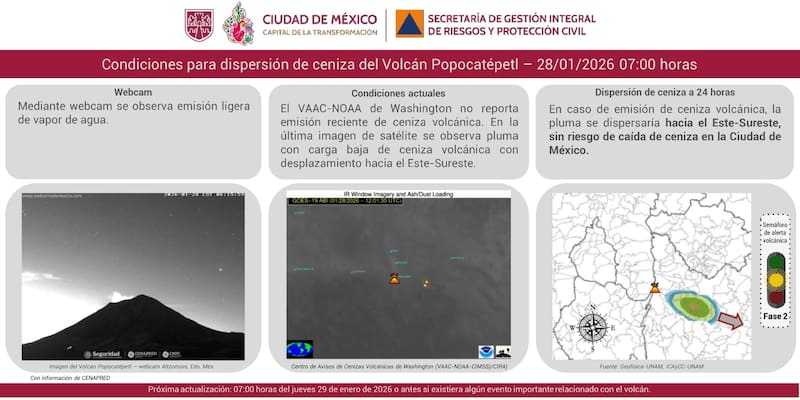 La SGIRPC detalló que “en caso de emisión de ceniza volcánica, la pluma se dispersaría hacia el Este-Sureste, sin riesgo de caída de ceniza en la Ciudad de México”. Además, el monitoreo vía satélite y webcam solo ha registrado emisión ligera de vapor de agua, sin reportes de ceniza significativa.