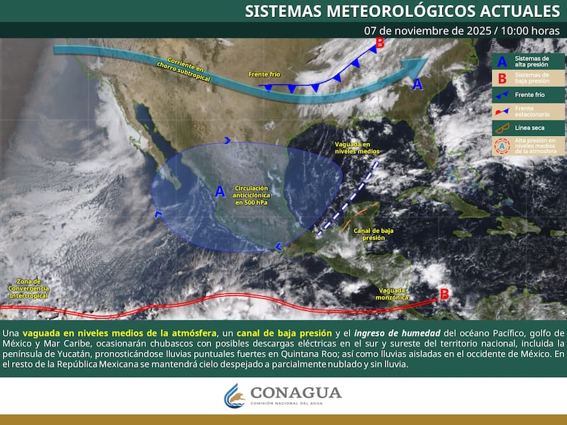 El Servicio Meteorológico Nacional advirtió que “el nuevo frente frío (núm. 13) y su masa de aire ártica asociada ocasionarán lluvias muy fuertes a puntuales intensas” en el oriente y sureste de México. El fenómeno marcará un giro drástico en el clima nacional.