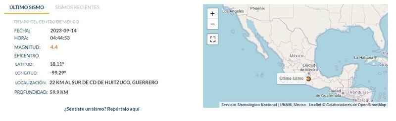 La madrugada del jueves 14 de septiembre, el Servicio Metrológico Nacional (SSN) reportó un sismo de magnitud 4.4 a 20 kilómetros de Ciudad de Huitzuco, Guerrero.