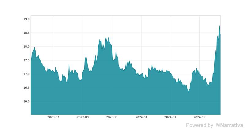 En el último año, el Dólar ha llegado a cambiarse en el mercado mexicano a un importe máximo de 18.7 MXN, mientras que su nivel más bajo ha sido 16.3 MXN.