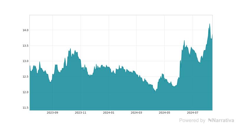 Este martes, 13 de agosto de 2024, la cotización deldólar canadiense llegó a 13.8538 MXN al cierre de los mercados en México. En base a esta cifra, el cambio que este activo ha tenido respecto a la sesión de inicio es de 1.12%.