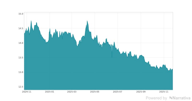 Durante el día de ayer, este activo presentó un costo máximo de 13.13 pesos y un mínimo de 13.11 pesos.