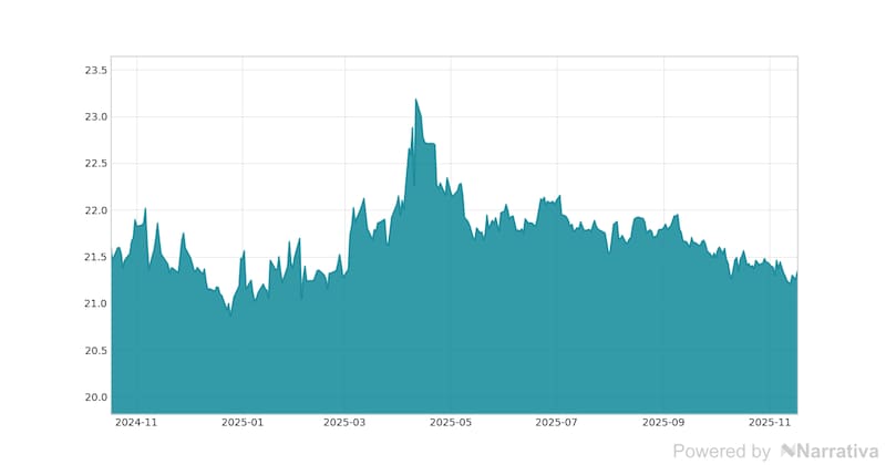 Durante el día de ayer, este activo presentó un costo máximo de 21.38 pesos y un mínimo de 21.28 pesos.