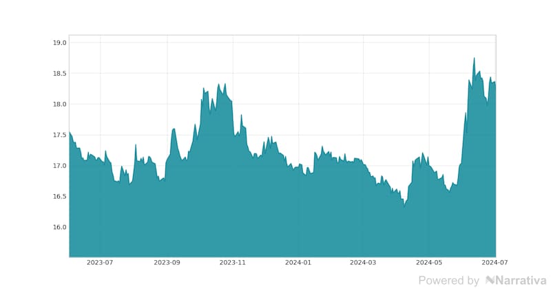 Durante el cierre de mercados de este martes, 2 de julio de 2024, el dólar alcanzó los MXN 18.25, cifra que refleja una variación de la moneda del -0.6% en comparación con su precio en la sesión de apertura.