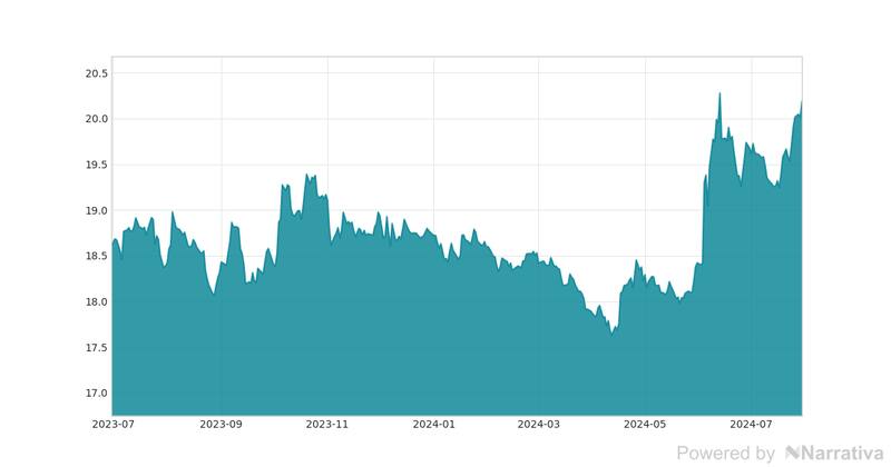 El Euro presenta una cotización de 20.12 MXN en la sesión de apertura de mercados en México este martes, 30 de julio de 2024, valor que refleja una alteración del 0.53% en comparación con el día anterior.