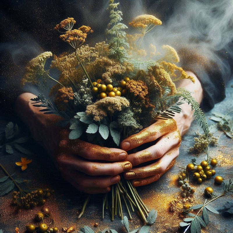 Toma el saquito de tela verde o dorada y colócalo sobre una superficie limpia y tranquila., luego, coloca las ramitas de ruda dentro del saquito, visualizando cómo esta planta poderosa abre los caminos y aleja las malas energías.