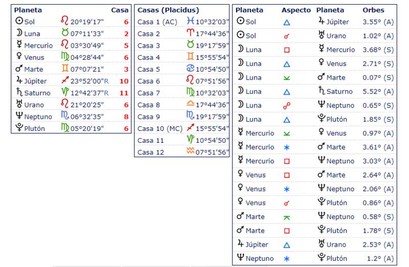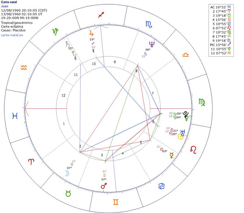 Por último aparecen los planetas y otros puntos celestes de importancia en astrología. Los aspectos de color rojo, por ejemplo, suelen representar relaciones tensas, mientras que los de color azul indican relaciones armónicas y fluidas entre planetas.