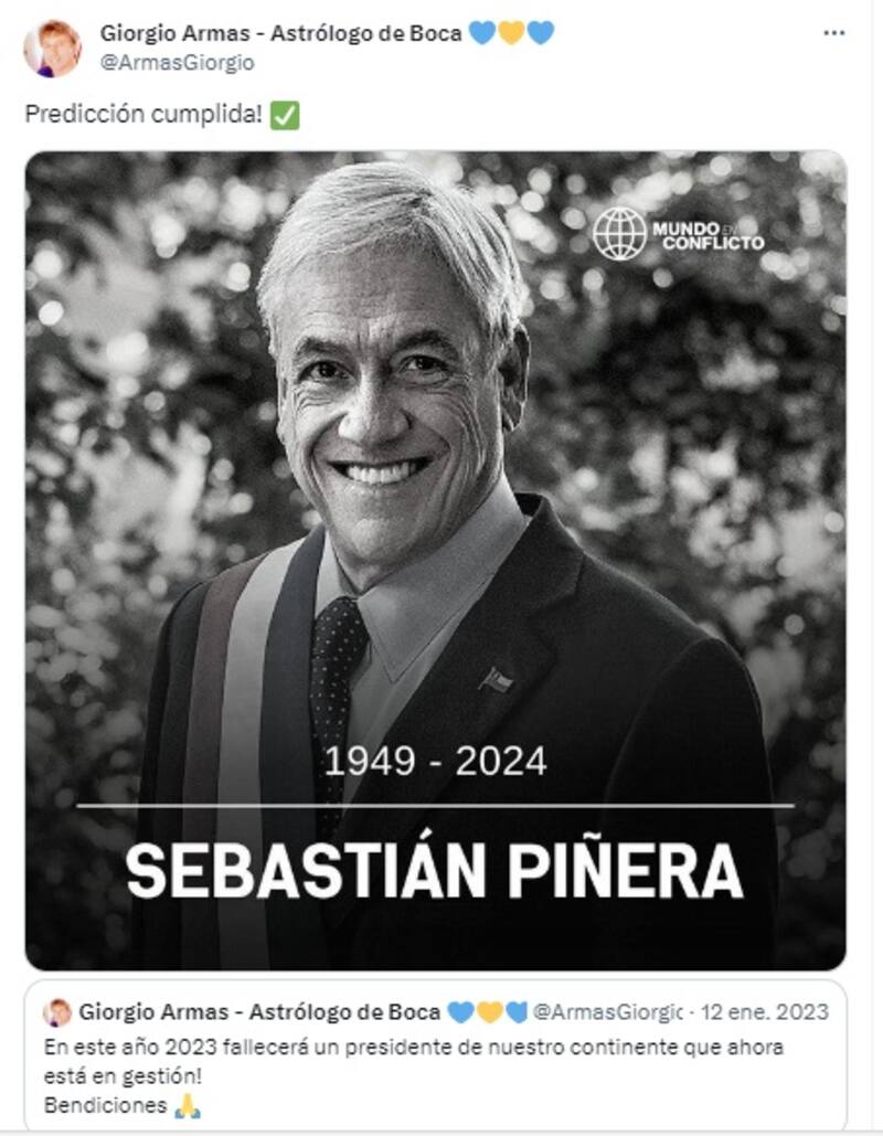 Poco más de un año atrás, Giorgio Armas había posteado: "En este año 2023 fallecerá un presidente de nuestro continente que ahora está en gestión! Bendiciones", sin más detalles. Por entonces, el posteo alcanzó moderada repercusión, pero que se reactivó tras la muerte del exmandatario chileno.