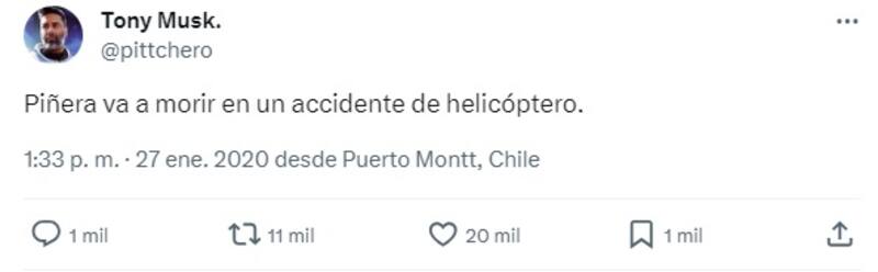 "Piñera va a morir en un accidente de helicóptero", fue el posteo del usuario identificado como Tony Musk que ganó gran repercusión tras la tragedia. El escalofriante vaticinio provocó que otros usuarios le hicieran preguntas sobre el futuro al usuario, quien respondió con divertidas y originales proyecciones.