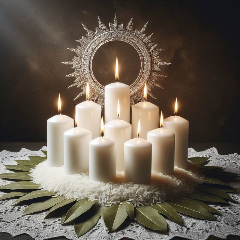El ritual a San José Obrero comienza colocando las 7 velas blancas en círculo, cada una de las velas puestas sobre una hoja de laurel, símbolo de victoria y honor en el trabajo, y las velas, representando la luz y la pureza que guían el camino del trabajo digno. En el centro, se coloca el puñado de arroz, símbolo de abundancia y sustento.