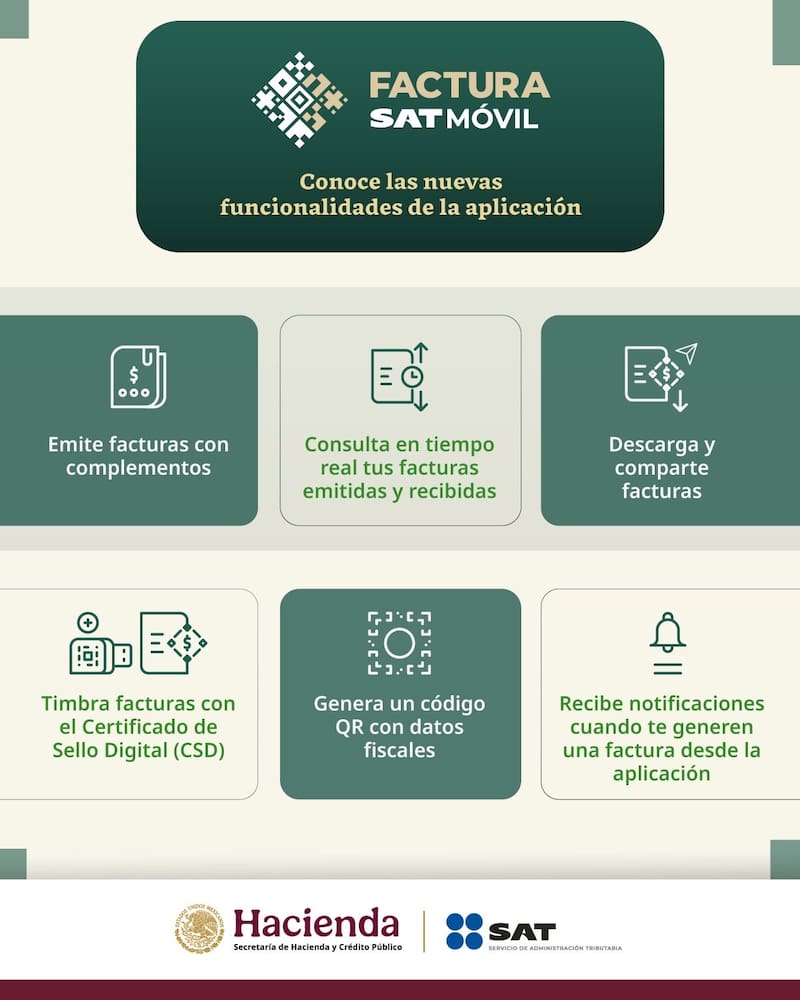 “Conoce las nuevas funcionalidades de la aplicación Factura SAT Móvil para realizar trámites y servicios desde tu celular. Disponible gratis en Google Play y App Store”, informó la Secretaría de Hacienda y Crédito Público junto con el Servicio de Administración Tributaria, SAT.