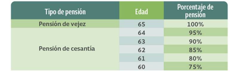 - Cesantía en Edad Avanzada y Vejez: se otorga a los asegurados de 60 a 64 años de edad que han quedado sin trabajo. El porcentaje de la pensión se designará de acuerdo con la edad en que se tramite, según: