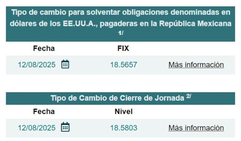 Para el 12 de agosto de 2025, Banxico estableció el tipo de cambio FIX en 18.56 pesos por dólar, mientras que el tipo de cambio de cierre de jornada se ubicó ligeramente más alto, en 18.58 pesos por dólar.