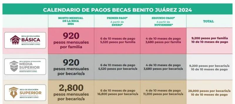 - Educación media superior: el primer pago de 5,220 pesos por becario se realizará a partir de enero, mientras que el segundo pago de 3,680 pesos por familia comenzará en noviembre.