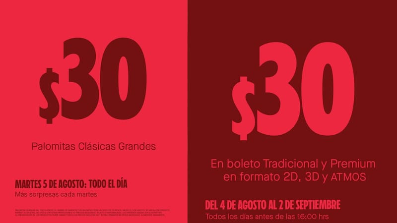 Durante todo agosto, Cinemex ofrece palomitas sal grandes a 30 pesos cada martes como parte de su celebración. Es una excelente oportunidad para disfrutar tus películas favoritas con un toque clásico en sabor y precio accesible.