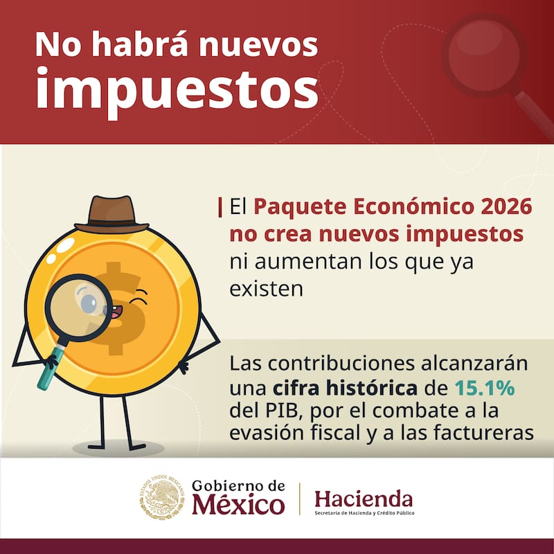 “El Paquete Económico 2026 no contempla nuevos impuestos. Fortaleceremos las finanzas públicas mediante una mayor eficiencia recaudatoria, en beneficio de todas y todos los mexicanos”, indicó Hacienda en su posteo y del cual se adjunta la imagen.