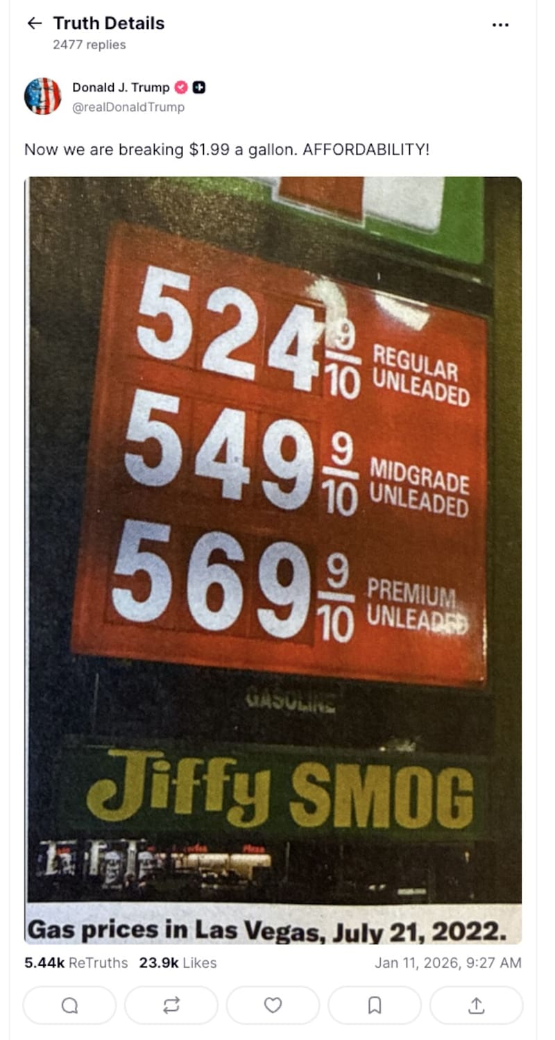 “Ahora estamos abriendo a 1.99 por galón. ¡Asequibilidad!”, señaló el mandatario estadounidense en su cuenta de Truth Social.