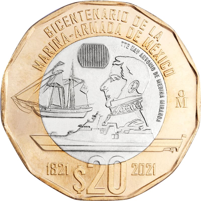 El diseño del reverso es un homenaje visual al teniente de navío José Antonio Medina de Miranda. Acompañan su imagen la goleta "Iguala" y el buque "Patrulla Oceánica de Largo Alcance", junto con un microtexto con su nombre, un ancla como imagen latente y la leyenda "Bicentenario de la Marina-Armada de México". En el exergo se puede leer la denominación de "$20" y los años "1821" y "2021", junto con la marca de ceca "M°" de la Casa de Moneda de México.