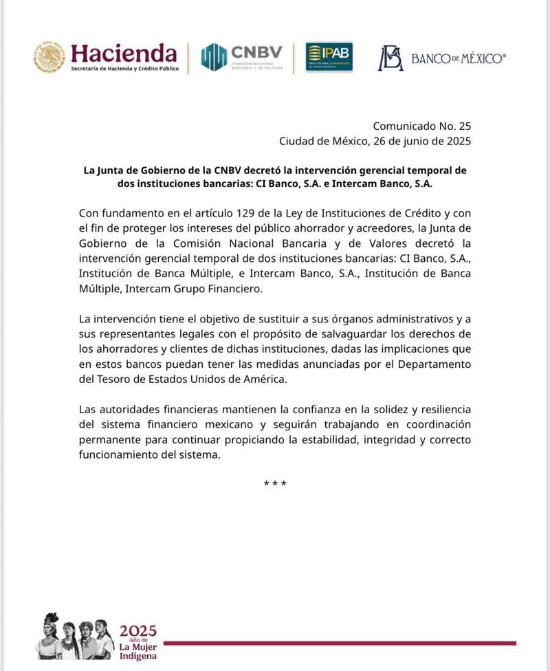 La medida, fundamentada en el artículo 129 de la Ley de Instituciones de Crédito, tiene como fin proteger los intereses del público ahorrador y de los acreedores. Según el comunicado oficial No. 25 emitido este miércoles por la CNBV a cargo de Jesús de la Fuente Rodríguez, la intervención busca sustituir a los órganos administrativos y representantes legales de las entidades, con el propósito de garantizar los derechos de los clientes ante las implicaciones de recientes acciones tomadas por el Departamento del Tesoro de Estados Unidos.