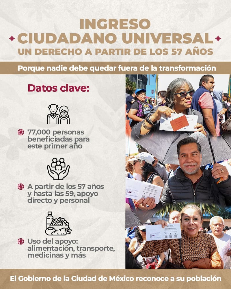 La inscripción al Ingreso Ciudadano Universal para personas de 57 a 59 años se realizará de manera directa y sin intermediarios. "A las personas que sean beneficiarias de este programa se dará un monto de 2,000 pesos bimestrales de manera directa", informó el Gobierno de la Ciudad de México.