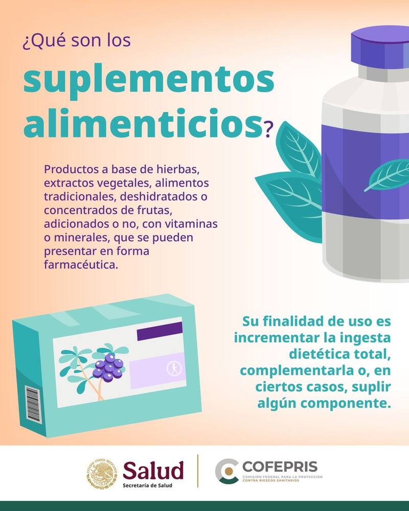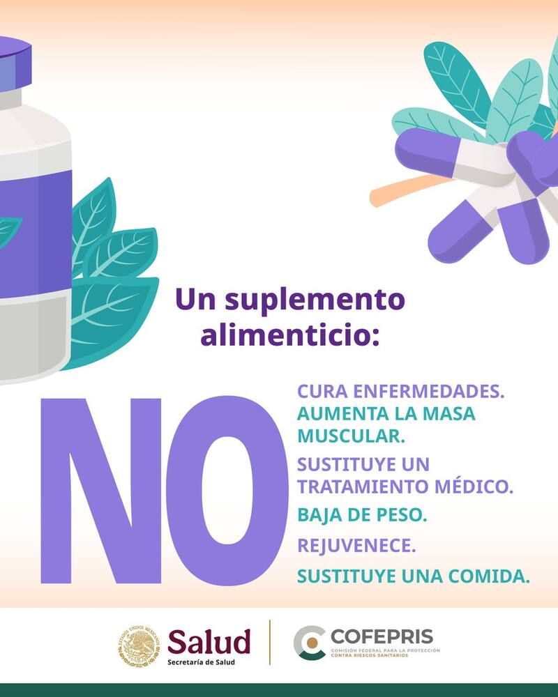 De acuerdo con la Comisión Federal para la Protección contra Riesgos Sanitarios, Cofepris, los suplementos solo "complementan la dieta" y no deben confundirse con medicamentos. Por ello, su consumo sin supervisión médica puede generar falsas expectativas y riesgos.