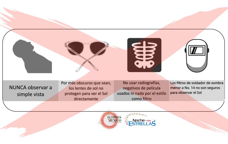 El Comité Nacional de Eclipses México hizo una aclaración sobre los lentes adecuados para ver el eclipse: "Estos filtros se pueden utilizar, ya sea directamente en los ojos, en las cámaras fotográficas de celular o profesionales, en los binoculares y en los telescopios y los hay de muy diversas marcas y precios".