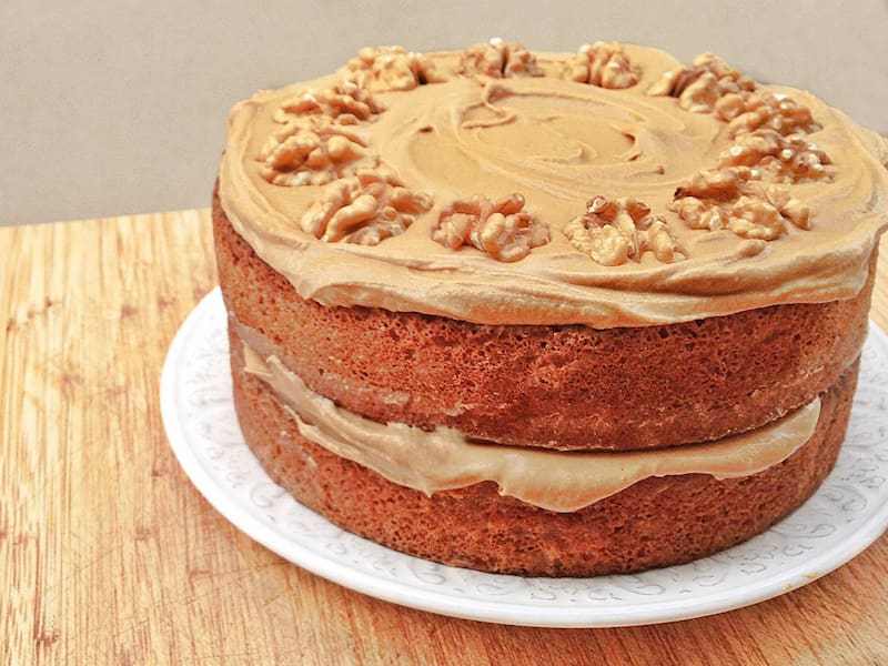 Armar el pastel. Si horneaste un solo bizcocho, córtalo por la mitad horizontalmente para crear dos capas. Coloca una capa de bizcocho en tu plato de servir. Extiende una capa generosa de glaseado de queso crema al café. Coloca la segunda capa de bizcocho encima. Cubre la parte superior y los lados del pastel con el resto del glaseado.